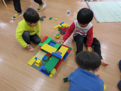 早速ままごとやブロックをして遊びました。初めはこあら組のお友達と遊ぶことが多かったですが、雰囲気に慣れてくると、ぱんだ組のお友達と一緒にままごとをしたり、ダンボールの中に入ったりして、関わって遊ぶ姿が見られるようになりました。