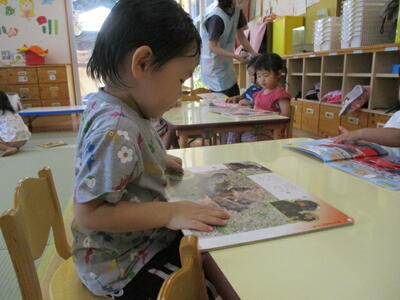 プール遊びでさっぱりした後は、部屋でゆったり絵本を楽しみました。1人で見たり友達と見たり、色々な姿が見られます。