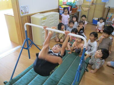 鉄棒にぶらさがります。周りの子ども達も友達の様子を見ています!