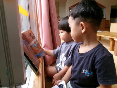 友達と並んで座ったり、一緒の絵本を見たりして嬉しそうでした。