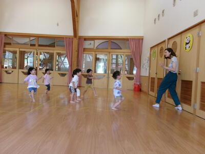 メリサさんにフランス版「だるまさんがころんだ」「アン・デュー・トゥワ・ソア」を教えてもらい一緒にしてみました。鬼さんの掛け声に合わせて走ったり、止まったりの繰り返しが面白かったようで、何回も全員が鬼になるまで楽しみました。その後は、粘土遊びをしました。