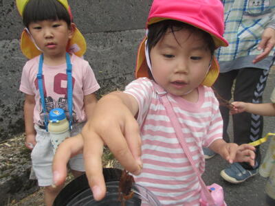久しぶりに砂遊びをしました。「ミミズのご飯作っとる」「工事しとる」「こしょう入れる穴作っとる」などといろんなことを考えて遊ぶ子ども達。砂がひんやり気持ち良くてよく遊んでました。