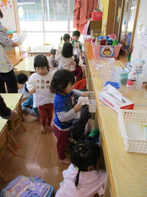 1年間使ったお部屋の掃除をしました。ロッカーの中のかごを出したり床を拭いたり・・・「次はりすさんがこあら組になるんだよなぁ!」と言いながらきれいにしていきました。