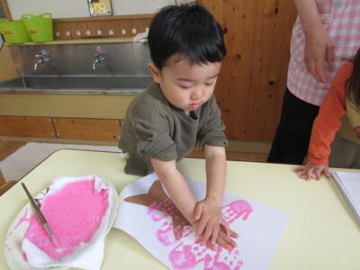 ピンクになった手のひらをじっと見たり、嬉しそうに画用紙に手形を押したりして、桜が満開になっていくのが嬉しそうなこあら組さんでした。