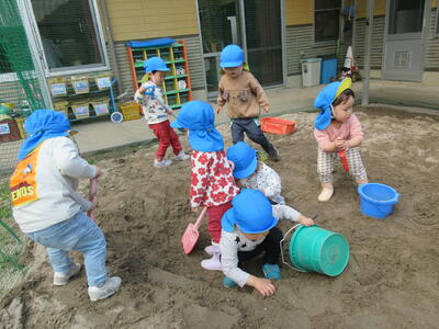 園庭に出て、砂場で遊んだり三輪車に乗ったりして好きな遊びを楽しみました。