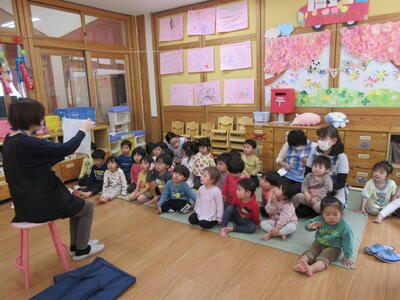 お話の合間に『つくしんぼ』や『キャベツの中から』などの手遊びも一緒にして、楽しい時間を過ごしました。