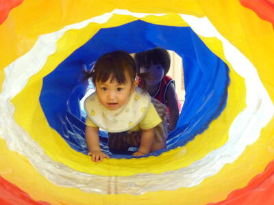 りす組さんと一緒に遊びました。マットの上に上ったり、トンネルをくぐったりしました。
