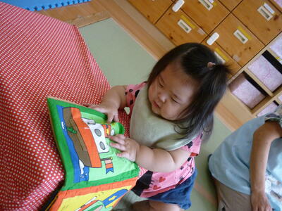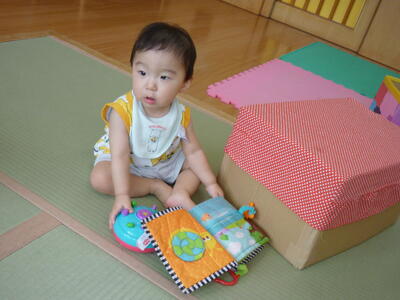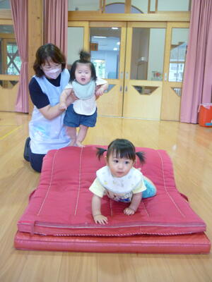 マットの山を支えてもらいながらジャンプをしたり、ハイハイで登って下りたりしています。