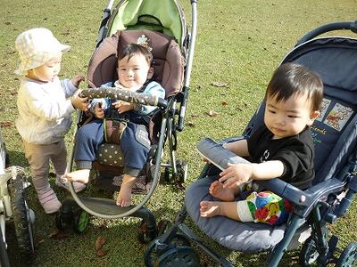 玄関で靴を履いてお散歩に行きました。なんとなく自分で靴を持って履こうとする姿が、一生懸命で可愛かったです。健康村に行って散策を楽しみました!