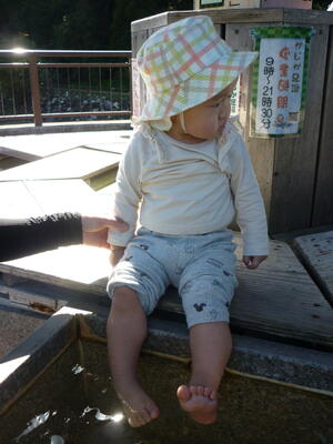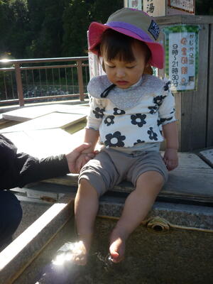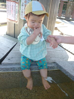 初めての足湯に行ってきました。足をちょんとつけてみると、初めはびっくりしてましたが温かくて気持ちの良いお湯に