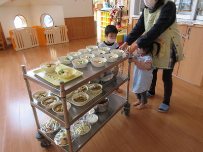 お当番さんは、エプロン・マスクを身に付けて、給食室に給食やおやつを取りに行ったり、みんなに配ったりします。
