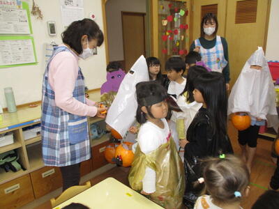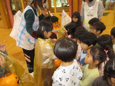 その後は、ジャックオーランタンに給食室から預かったゼリーを入れて、それぞれのクラスに配りに行きました。「お菓子も配れて楽しかったな」と満足していたぞう組でした♬