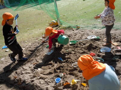 今日の砂遊びはご馳走つくりではなく、先ほど捕まえたカマキリのお家つくりのようですよ。