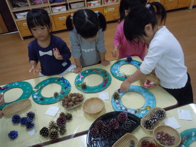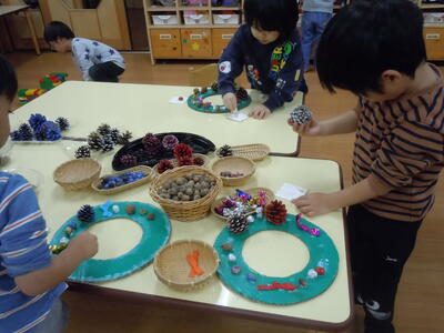 ホールではお茶会が開かれていたので少々声の大きさを抑えながら遊んだり、クリスマスリースをつくったりしました。みんな声を小さくすることが上手です。どうやって覚えたのかなぁ・・・?