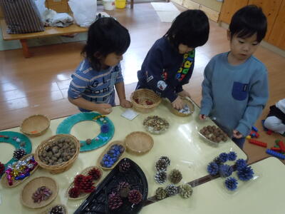 机の上にたくさん置かれた松ぼっくりやみんなで拾ったどんぐり達が並び、目を輝かせて選んでいきます。