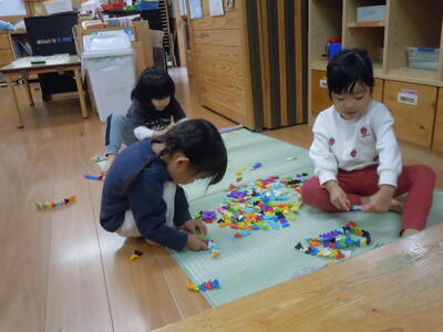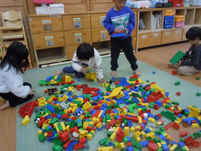 今日は朝からブロック遊びを楽しむ姿がたくさん見られたので、いろいろな組み立て遊びをしてみました。