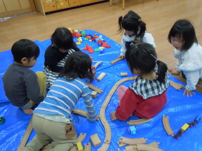 「せんせい、そとあそびは?」と言う声に、「どうかな?外で遊べそうかな?」とテラスに出られる大きな窓を開けると、「さむいなぁ・・・・。」と窓から離れていく子ども達。昨日とは違って気温の低い日でしたね。