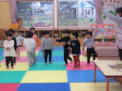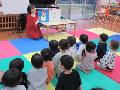 その後は、おはなしたんぽぽさんに大型絵本やパネルシアターのお話をしていただきました。クリスマスにちなんだお話をしていただき、「サンタさんだ」「雪だるま!」と嬉しそうに聞いていました。