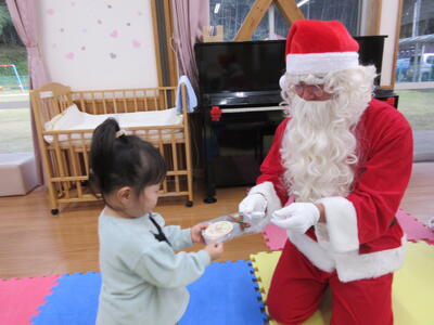 サンタさんが来てくれて、みんなの目が釘付けでした。サンタさんのお話を聞き、サンタさんのことをたくさん知ることができました。サンタさんはクッキーが好きだそうです。
