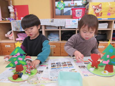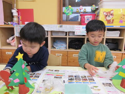クリスマスグッズの製作をしました。綿を手のひらで〝ころころ~〟と丸めてツリーの土台に付けていきました。みんな上手に丸めていましたよ。「明日はサンタさん来なるだよ」「大きいサンタさんだよ」「パウパトのおもちゃが欲しい♡」と、お喋りも弾んでいました。明日のクリスマス会を楽しみにしているこあら組さんです。