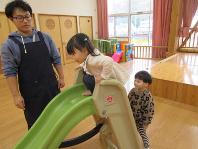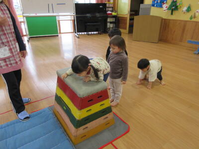 その後は、ホールで遊びました。すべり台やトランポリン、飛び石や跳び箱ジャンプなどで体を動かして遊びました。