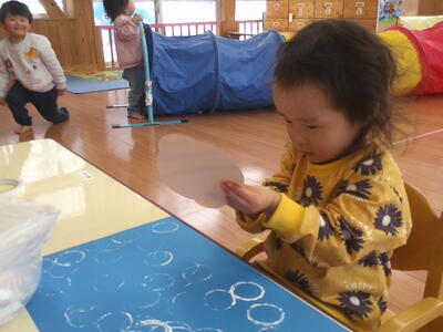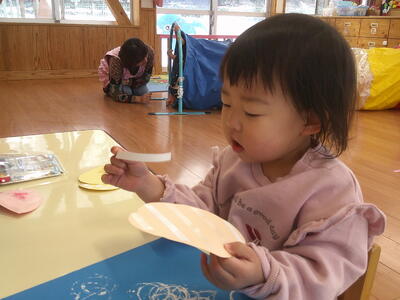 製作遊びで、両面テープ剥がしをしました。