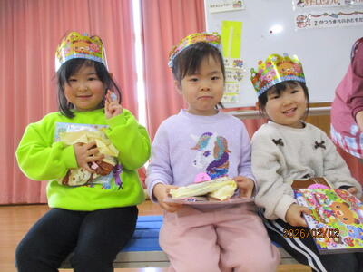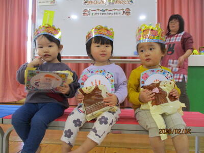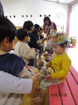 集会で歌を歌ったり、約束をみんなで確認した後は、お待ちかねの節分誕生会です。
