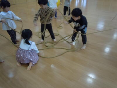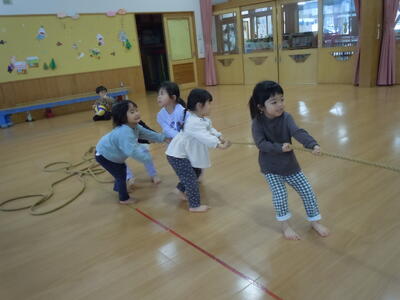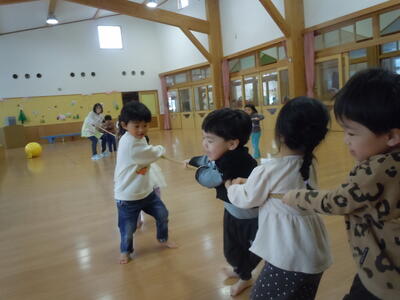 ホールで遊んでいると、縄跳びを出して引っ張り合う遊びが始まりかけたので、それなら・・・と綱を出しました。
