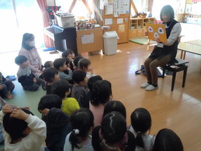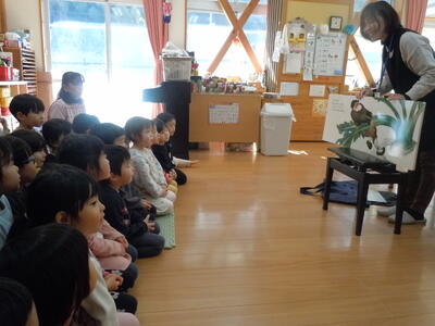 しゃくなげ号お話会があり、図書館の方が持ってこられる絵本袋からどんな絵本が出てくるのかみんなワクワクしていました。
