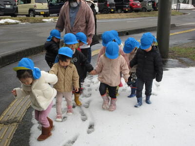 雪がまだ残っていて、雪の上を歩くと「サクッ、サクッ」という音がするのを楽しんでいました。