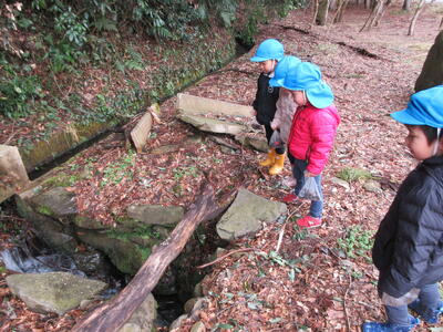 かじか橋近くの広場でも遊びました。川の音を聞いたり、草刈りした草の塊の上を歩いて、フカフカの感触を楽しんだりして、五感を使った散歩を楽しんだこあら組さんです。
