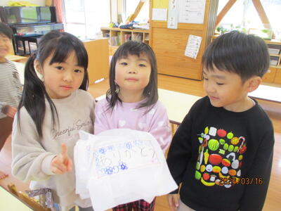 部屋に帰ってから、ぞう組の子ども達に感想を聞くと、「楽しかった!でもさみしいな・・」という声が聞かれました。みんなにお祝いしてもらって嬉しい反面、卒園が近くなり寂しさも感じているようです。