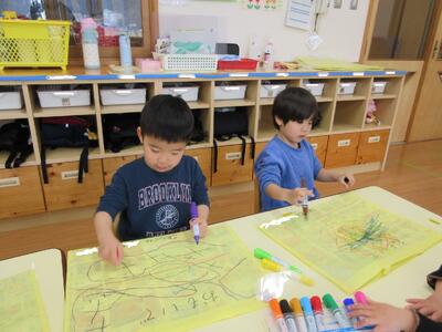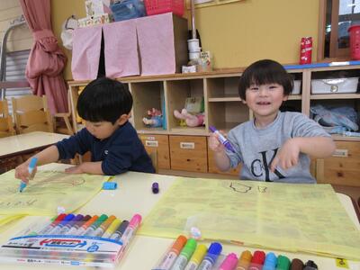 「これ恐竜だよ。ガオーってしとる」「消防団かくよ。これホース!」と描きたいものをイメージしながらお絵描きする姿もあり、成長を感じました。