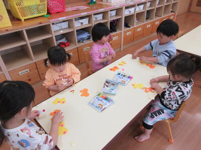 「ちょうちょ!」と嬉しそうに指差ししたり、「ちょうちょ~、ちょうちょ~♪」と歌を歌いながらシール貼りを楽しんでいましたよ。指先を使った遊びもじっくり楽しむこあら組さんです。