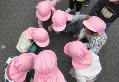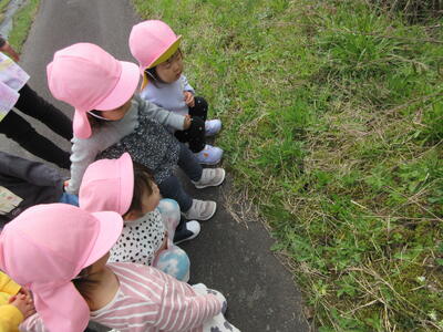 横手方面へ歩いていくと、アリや毛虫、トンボや蝶々など、たくさんの生き物と出会いました。その度にじっと観察したり「見て―」と保育者に知らせてくれたりしていました。「いっぱいおる」「あっち行った」と、気付いたことを言葉にしながら、観察を楽しんでいましたよ。
