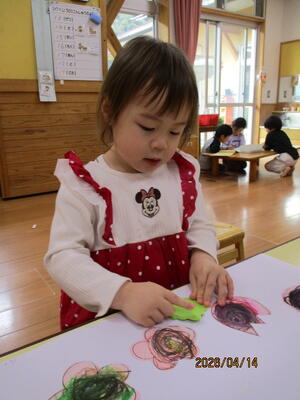 昨日色塗りしたお花に、葉っぱをのりで付けてみました。