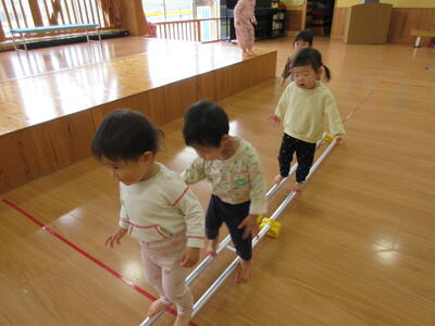 すべり台やトンネルくぐり、バランス棒渡りや跳び石ジャンプなど、体を動かして遊びました。