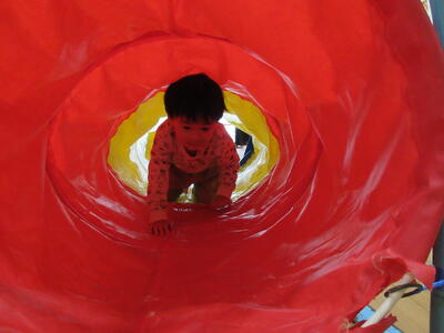 トンネルから出てきて、保育者や友達と目が合うと、ニコッと嬉しそうでした。