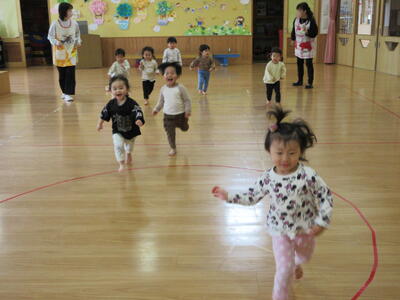 片付けをした後は、みんなでかけっこをしました。「もう一回!」とリクエストがあり何度もかけっこをして楽しみました。雨の日でもしっかり体を動かして、元気いっぱいのこあら組さんです。