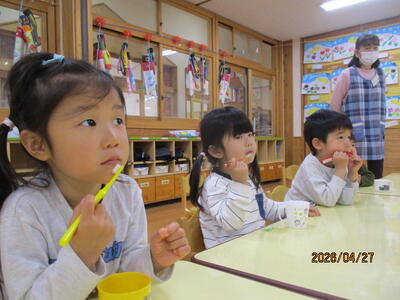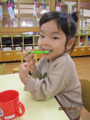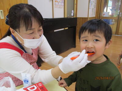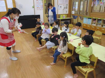 歯みがき教室がありました!(ぱんだ組) 投稿: みささこども園 (14:10) カテゴリー: ぱんだ組 今日は、歯みがき教室があり、歯科衛生士さんから 歯ブラシの持ち方や歯磨きが大切であることなどを教えてもらいました。 歯みがきするときの、大きな口「あ~」の形をして見せてくれました。 よく磨けそう! 話を聞きながら、歯磨きを一緒にしていきましたよ。 大きな歯の模型を見ながら、歯磨きシュッシュッ! 最後は、フッ素も塗ってもらいました。 これからも「食べたら磨く」を合言葉に、歯を大切にしていこうね! Tweet -