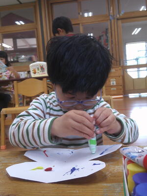 絵の具をつけ終わると、2つに折って、擦り合わせます。