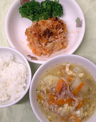 今日は「食育の日」です。三朝町や県内の食材、郷土料理を取り入れた献立を実施します。今日のグラタンは三朝町神倉集落で古くから受け継がれてきた品種「三朝神倉」使用しています。一般的な大豆と比べ、大粒で肌の健康に役立つ大豆イソフラボンを2倍近く含みます。