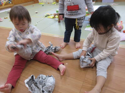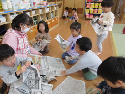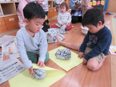新聞紙を丸めたり、紙にくるんだりして、食べ物をつくりました。
