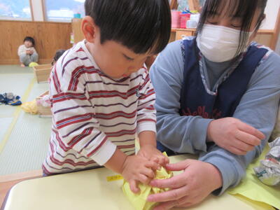 「こう?」「できたよ」と、絵本に出てくるお話の食べ物をイメージしながらつくりました。
