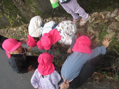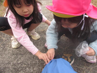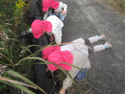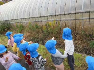 河川敷沿いの遊歩道を歩いていると、ハウスの中にカマキリがたくさんいるのを発見!寒くなってきて、温かいハウスの中が心地良いのでしょうか。「カマキリ!」「いっぱいおる!」と大興奮のこあら組さんでしたよ。