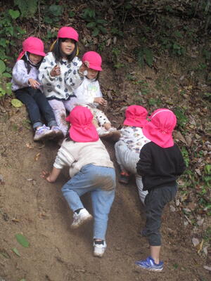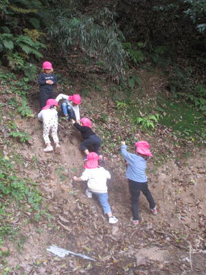 「そこどんぐり落ちとるよ」「ちょっとこの木洗ってみるわ」「こっちからなら登れるかもしれん・・・」などなど、いろんな声が聞こえてきて、見守っているのも楽しいです。