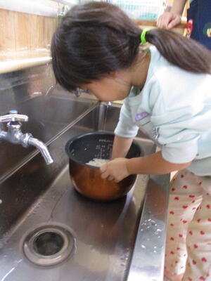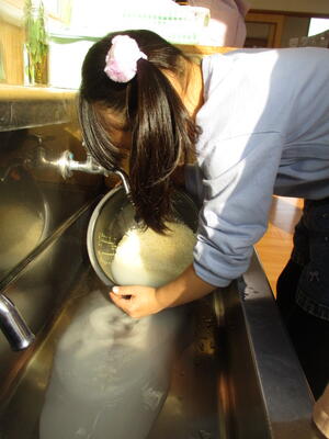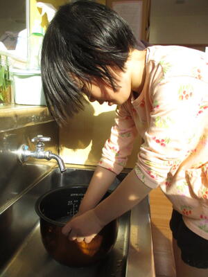 その日の当番さんが、米研ぎをして、メモリを見ながら水を入れています。
