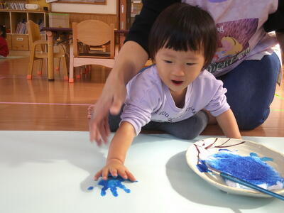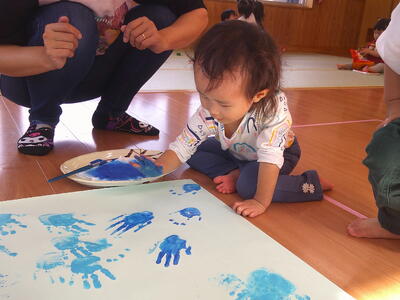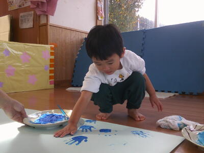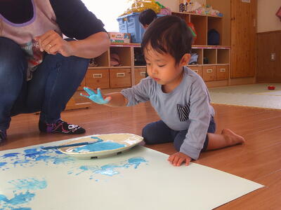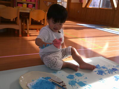 今日は青や水色で手形をペタペタ取りましたよ。