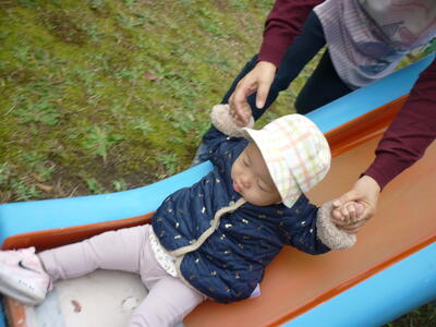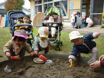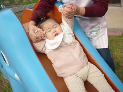 中庭で遊びました。りす組さんが砂場で遊んでいるのを見て、興味津々な子ども達。砂遊びする?と誘うと嬉しそうに砂遊びを始めました。砂場遊び以外にも、象さんのすべり台を何度も滑って楽しむ子もいました。