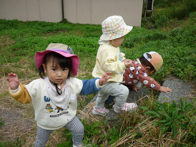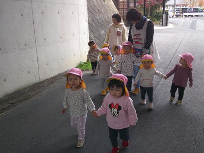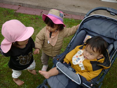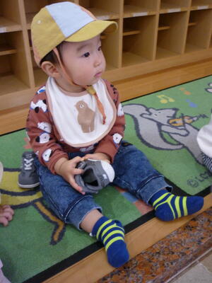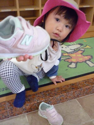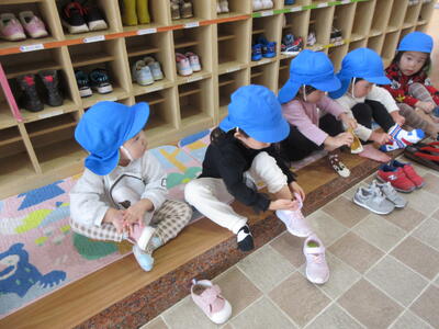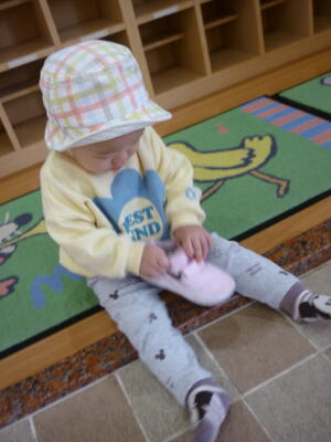 玄関で靴を履いてお散歩に行きました。なんとなく自分で靴を持って履こうとする姿が、一生懸命で可愛かったです。健康村に行って散策を楽しみました!